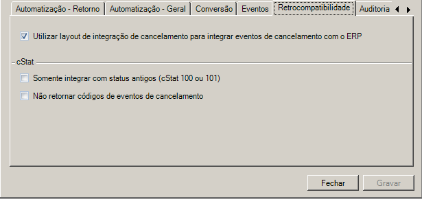 •Se marcada a opção Somente integrar com status antigos (cStat 100 ou 101), fará com que o motivo e o status do documento autorizado que possuir o cStat 150 retorne na integração o cStat 100, e para documento cancelado que possuir o cStat 151, 135 ou 155 integra com cStat 101.