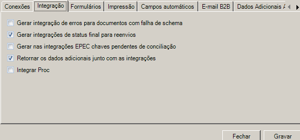 O fato de ser retornado na integração, não significa que foi realizado algum processo interno, somente que foi enviado na massa ou existem configurações na aba "Dados adicionais automático". Caso existir configuração na aba "Dados adicionais automáticos" e for informado na massa de envio, nem todas informações estarão presentes nas integrações citadas, prevalecendo o campo adicional informado na massa de envio.Os seguintes valores da aba serão ignorados quando forem informado na aba e na massa: ePrintServerAddress PrinterKey ContingencyPrinterKey B2B BaseForm PrintNumber Os mesmos são detalhados na descrição da aba "Dados adicionais automáticos" mais abaixo. |