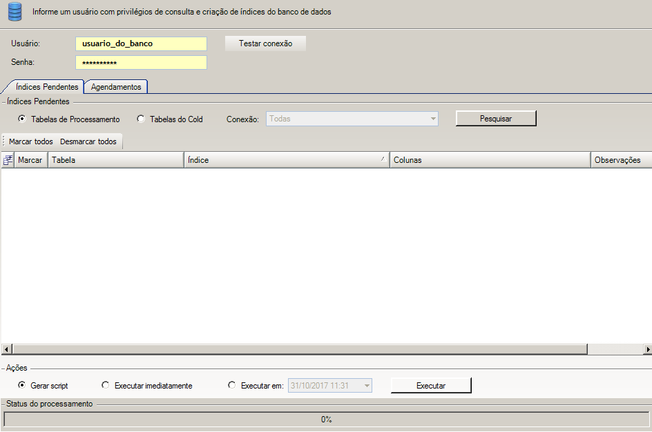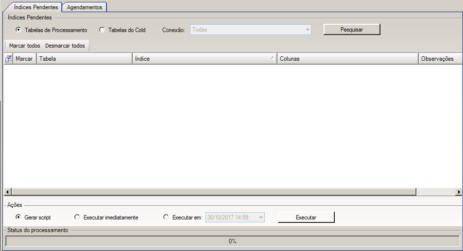 Índices Pendentes: Selecione qual tabela deseja executar a varredura (processamento ou Cold) e clique em pesquisar;