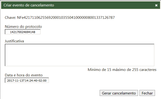 •O campo "Justificativa" virá vazio para preenchimento, sendo informada a justificativa do cancelamento. (Mínimo de 15 caracteres e máximo de 255);