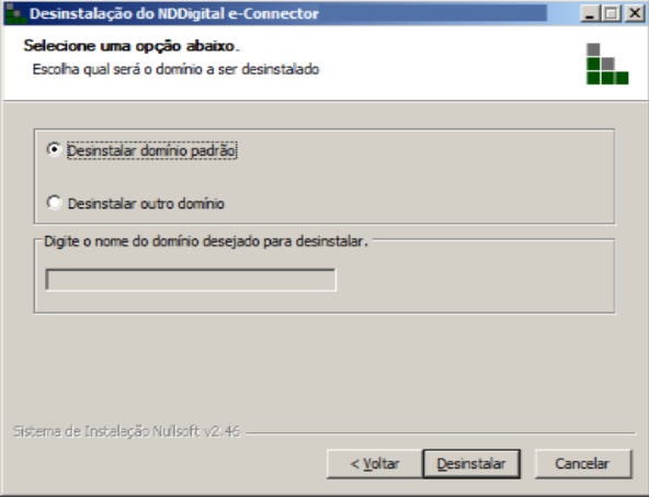 Desinstalar outro domínio: Deve ser preenchido o campo "Digite o nome do domínio para desinstalar", onde o nome informado será o domínio a ser desinstalado.