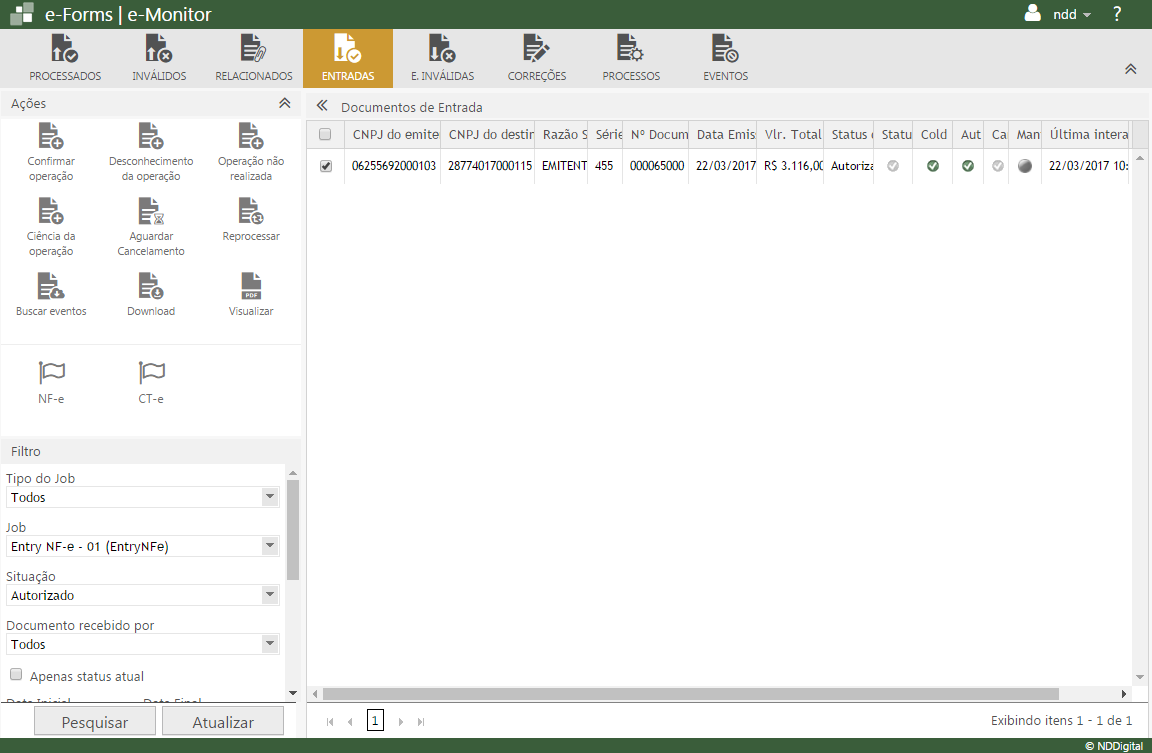 A ação Visualizar, disponibiliza na aba de "Documentos de Entrada" os documento em PDF no e-Monitor.
