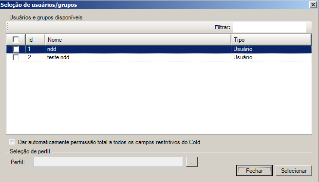 "Usuários/Grupos" para selecionar o usuário ou grupo à conceder a permissão para os campos restritivos em questão.