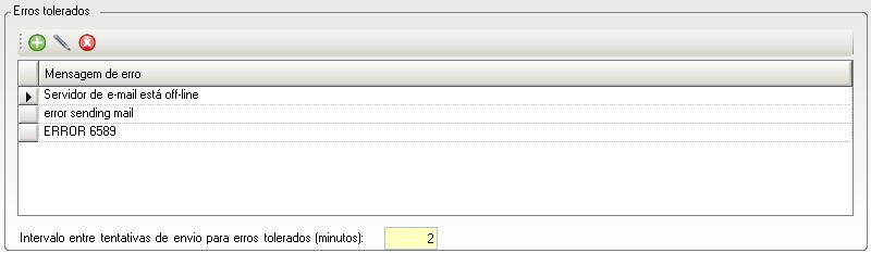 Na aba B2B também é permitido inserir mensagens de erros tolerados, e um valor em minutos para utilizar como intervalo entre as tentativas de envio de e-mail quando ocorrerem erros com as mensagens cadastradas. Para inserir as mensagens de erro, clique em