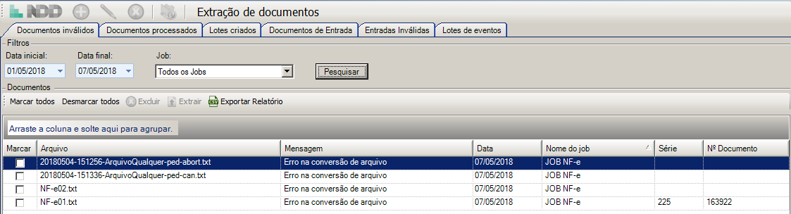 A extração de documentos inválidos contempla arquivos de NF-e, CT-e e MDF-e