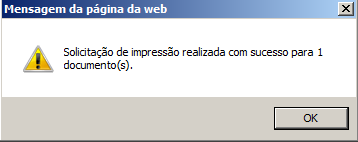 Ao efetuar um clique no botão Imprimir, será criado uma solicitação de impressão será exibida a mensagem abaixo informando que a solicitação impressão foi realizado com sucesso para os documentos selecionados: