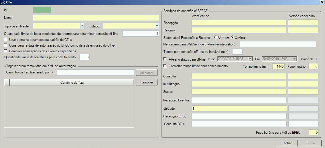 l.Tags a serem removidas em XML de autorização no campo Caminho da Tag (separado por '/'): preencha com o caminho (hierarquia dos grupos) até chegar a Tag que deseja que seja removida no XML de autorização e clique no botão Adicionar. Esta funcionalidade deve ser utilizada quando houveram alterações de schema, porém a SEFAZ estadual ainda não está adequada para o recebimento destas alterações. Quando houver a adequação é necessário a remoção das Tags que foram cadastradas para realizar o envio das informações para a SEFAZ.