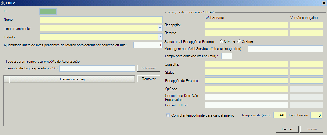 h.Tags a serem removidas em XML de autorização no campo Caminho da Tag (separado por '/'): preencha com o caminho (hierarquia dos grupos) até chegar a Tag que deseja que seja removida no XML de autorização e após, clique no botão Adicionar. Esta funcionalidade deve ser utilizada quando houver alterações de schema, porém a SEFAZ estadual ainda não está adequada para o recebimento destas alterações. Quando houver a adequação é necessário a remoção das Tags que foram cadastradas para realizar o envio das informações para a SEFAZ.