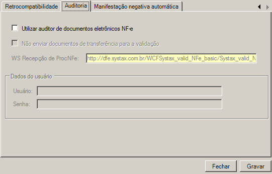 •Ws Recepção de ProcNFe: Deve ser preenchido com o WS de recepção do auditor.