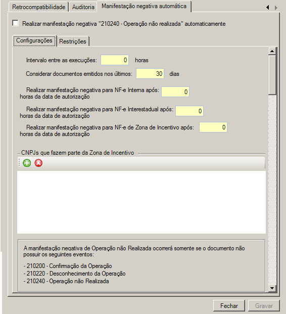 Ao cadastrar um CNPJ no campo "CNPJs que fazem parte da Zona de Incentivo" significa que qualquer NF-e 2.00 ou 3.10 processada, irá respeitar o tempo configurado no campo "Realizar manifestação negativa para NF-e de Zona de Incentivo após horas da data autorização da NF-e" para disparar a manifestação operação realizada automaticamente. |