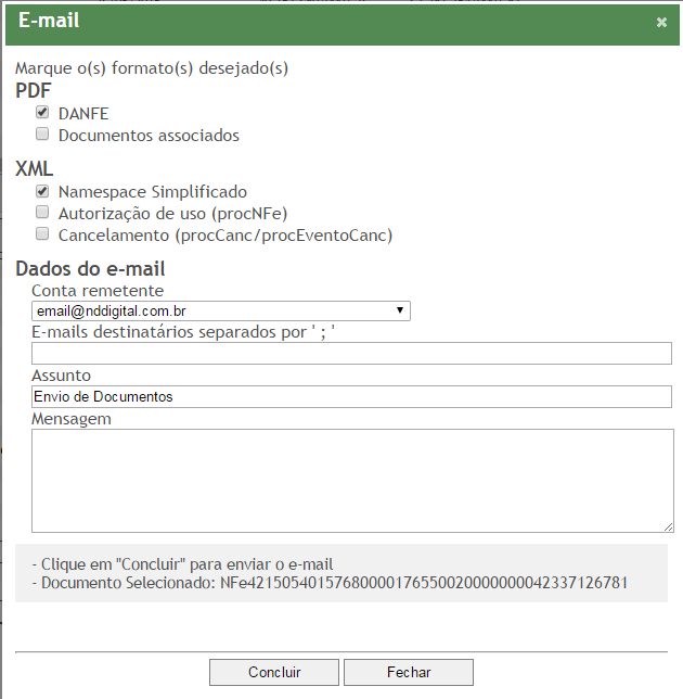 Além das opções de formato, devem ser inseridos os dados de e-mail para o envio dos documentos.