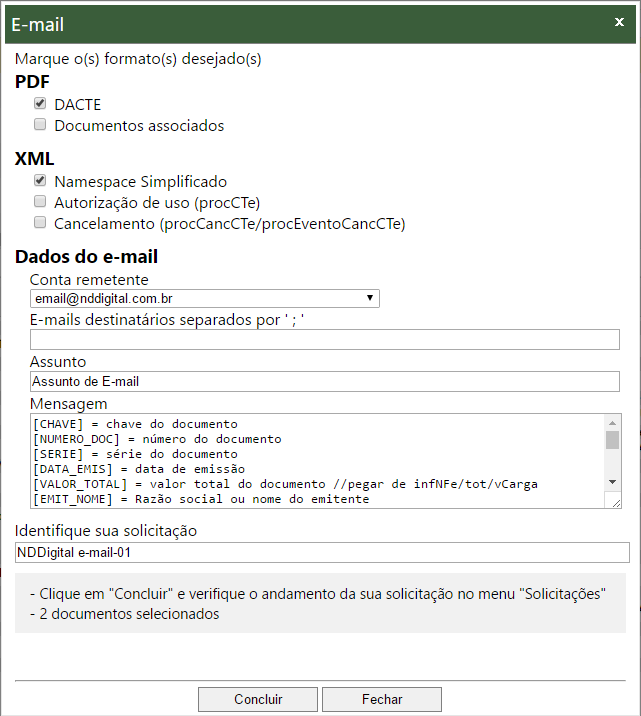 Após marcar os documentos e formato desejado, identificada a solicitação, configurado conta de e-mail e assunto/mensagem, clique em Concluir. Será informado ao usuário sobre o sucesso ou não da geração da requisição.