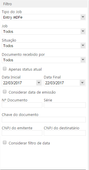 No Filtro Avançado para documentos Entry MDF-e é possível efetuar pesquisas por Número, Série, Chave do Documento, CNPJ do Emitente, CNPJ do Destinatário ou filtrar por Considerar Filtro de Data.