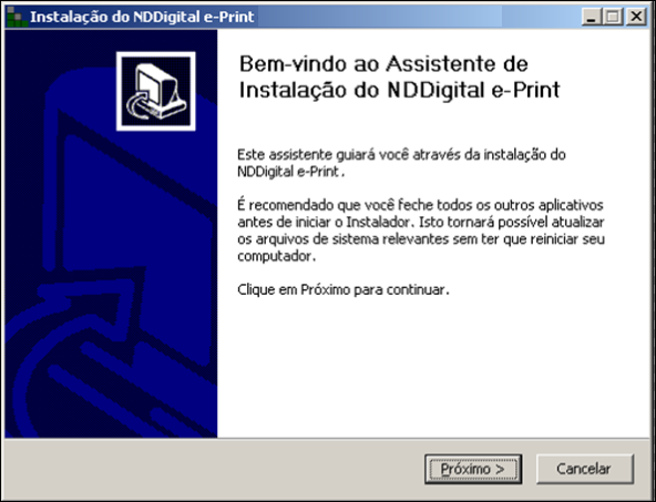 Passo 1: Execute o arquivo de instalação do e-Print Server fornecido pela NDDigital. Você também pode fazer o download dos instaladores acessando o site da NDDigital, efetuando seu cadastro de usuário, para isso acesse www.nddigital.com.br. É necessário antes de aplicar a instalação e-Print o pré-requisito Framework 4.0 estar instalado.
