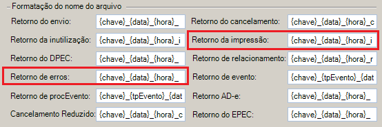 •Formatação do nome do arquivo: nome que será dado aos arquivos de retorno do envio, retorno do cancelamento, retorno da inutilização, retorno da impressão, retorno do DPEC, retorno de relacionamento, retorno de erros, retorno de evento, retorno de procEvento, retorno AD-e, cancelamento reduzido, Retorno do EPEC e retorno da consulta de dest., retorno auditor, retorno da distribuição DF-e e retorno da consulta de doc não encerrados. O nome do arquivo pode receber três parâmetros para diferenciá-lo, são eles: chave de acesso {chave}, data de envio {data}, hora de envio {hora} o tipo de evento {tpEvento} é o parâmetro utilizado somente para retorno de eventos. Também é possível utilizar uma literal no final ou no início desses arquivos.