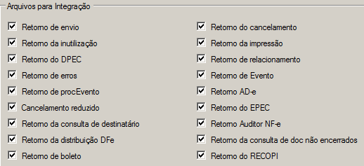 m.Em Arquivos para a Integração pode ser determinado as integrações que serão ou não geradas para o ERP mesmo quando as mesmas forem retornadas. Para não gerar algum retorno, desmarque as opções desejadas e para gerá-las remarque as mesmas.
