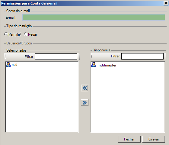 e.Através desta tela é possível permitir ou negar acesso aos usuários ou grupos, basta selecioná-los na guia Disponíveis e clicar em