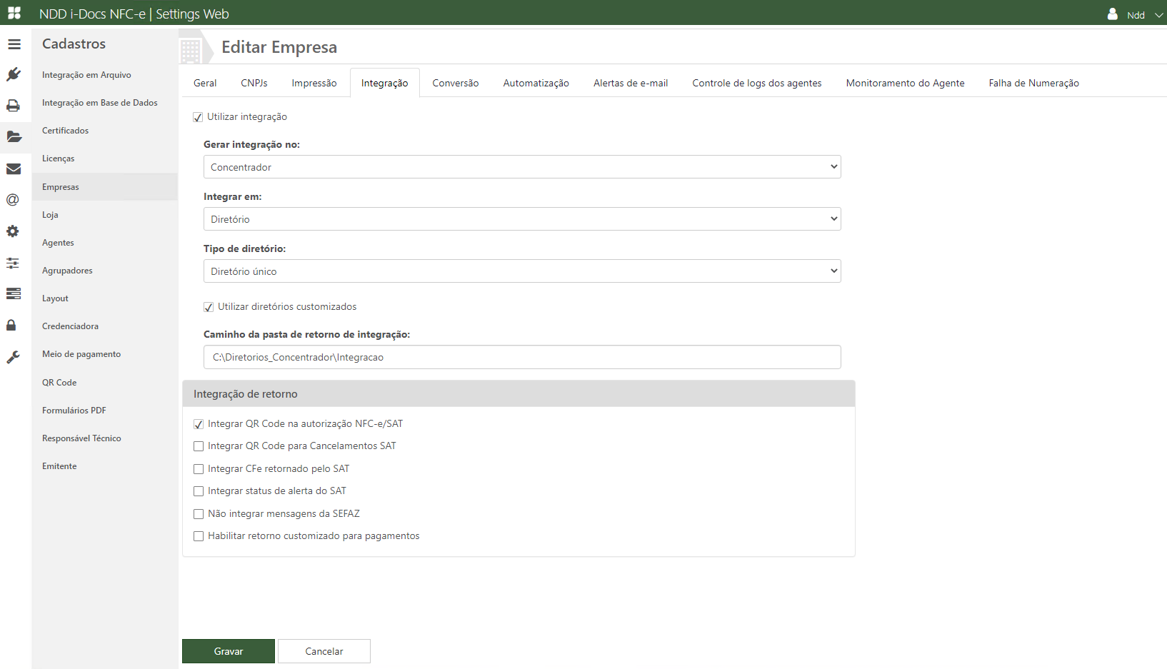 ✓ Utilizar envio via integrador: Habilite este checkbox para utilizar os dados do contribuinte para solicitação de token e comunicação com o Portal SEFAZ Direct;