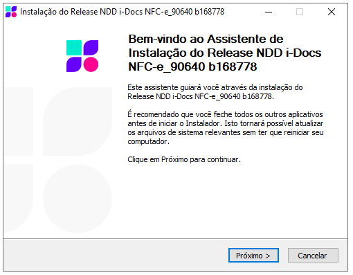 O instalador do e-Forms NFC-e faz a verificação de todos os componentes que são pré-requisitos para o seu funcionamento, caso não detecte algum, apresenta mensagem informando que é necessário instalar o pré-requisito para iniciar a instalação. Após todos os pré-requisitos conferidos, é permitido instalar o e-Forms NFC-e. Será exibida a tela inicial do instalador, clique em Próximo: