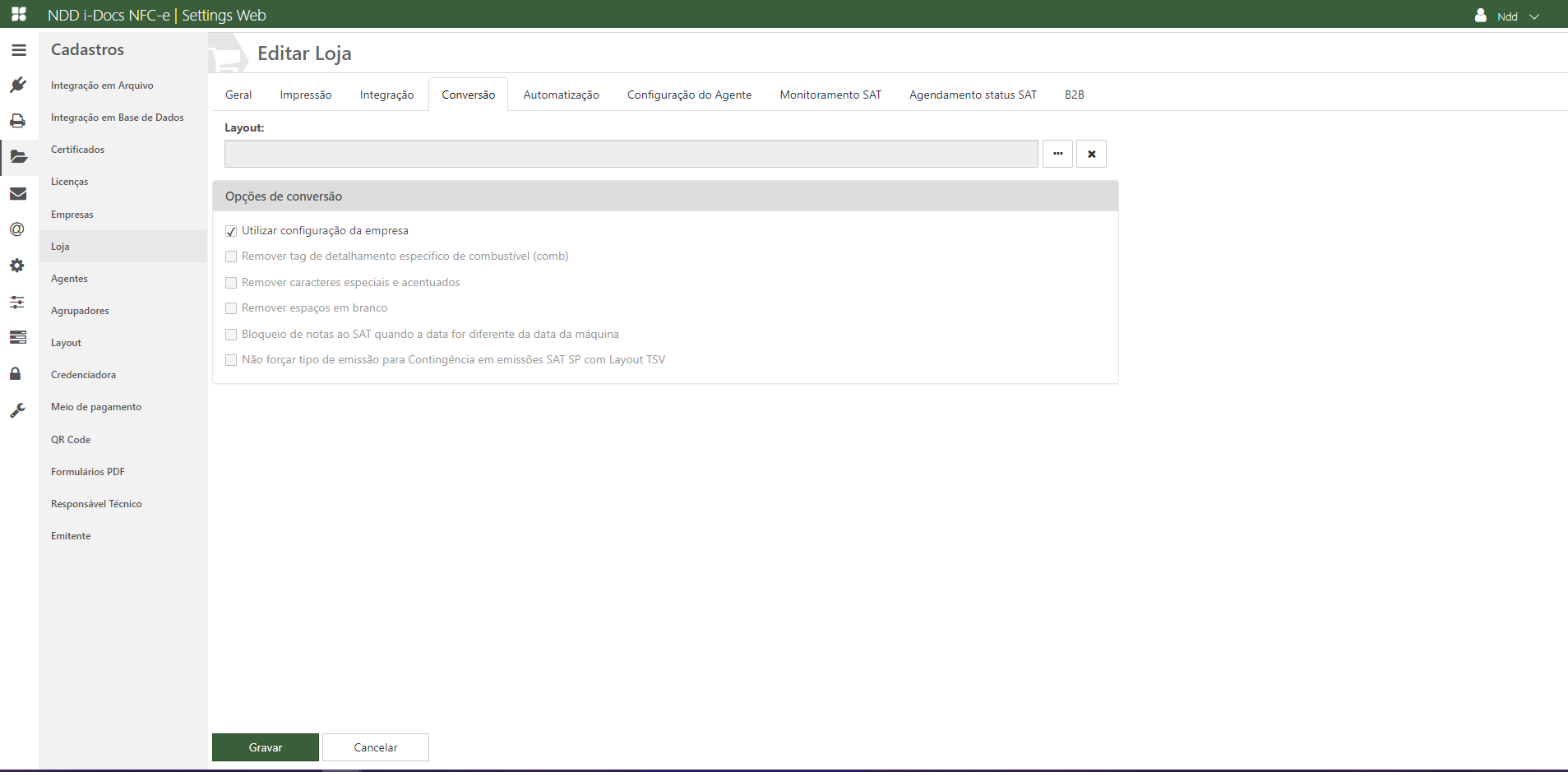 ✓ Layout: Neste campo será possível indicar o uso de um layout específico para a loja (cadastro de layout);