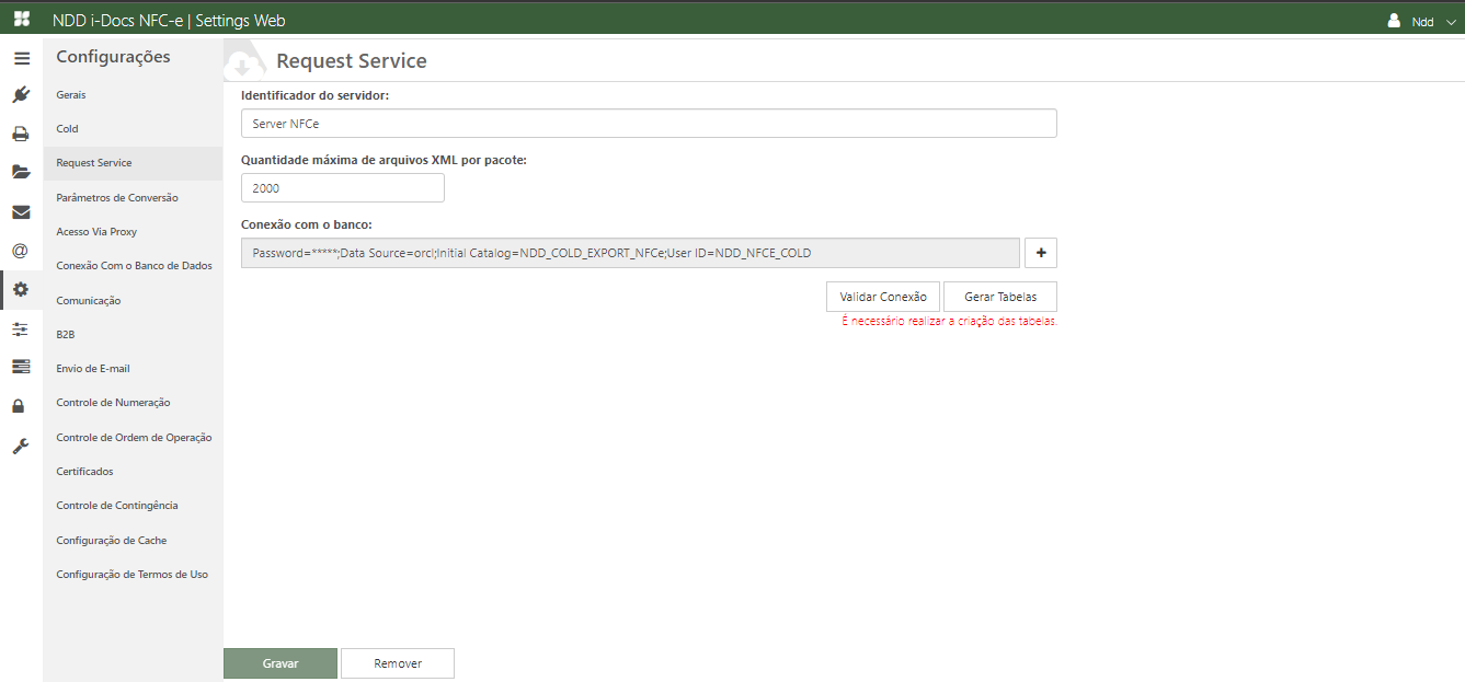 Após preencher todos os campos necessários, clique em Validar Conexão, se os dados estiverem corretos as tabelas (tbRequest, tbRequestDocument e tbRequestInstance) poderão ser geradas através do botão Gerar tabelas.