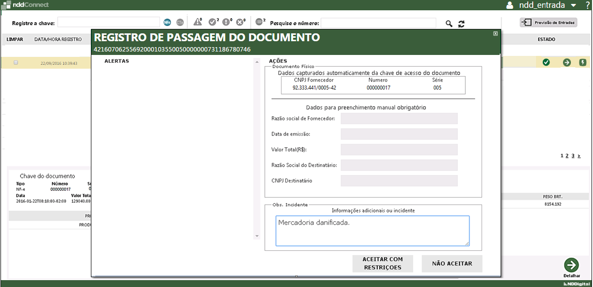 Após isso, é possível realizar a entrada do documento e/ou mercadoria como "Aceito com Restrições" ou ainda, "Não Aceitar". Caso ao recepcionar o documento alguma informação inserida manualmente conflite com os dados relacionados na Nota Fiscal, as informações serão atualizadas.