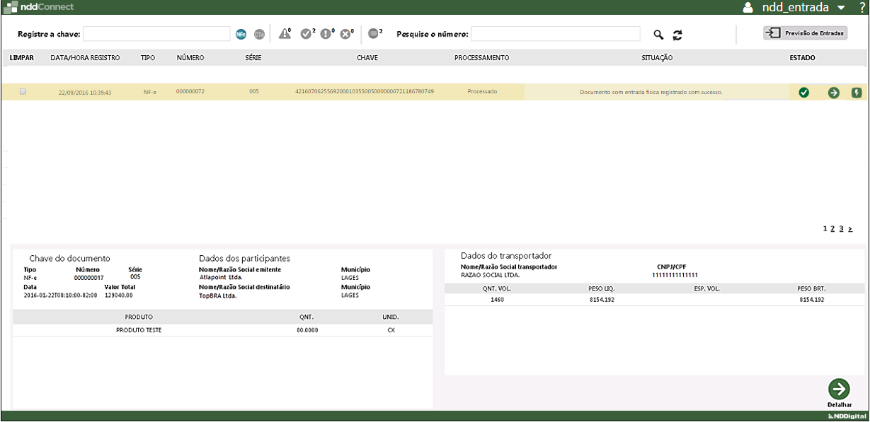 O registro de passagem de um documento ou mercadoria pelos departamentos de Entrada e Conferência Física, denota que a empresa e/ou departamento conhecem a existência destes e que um apontamento indicando uma ação sobre eles foi realizado, através da aplicação. Ao inserir uma chave de NF-e / CT-e no campo Registre a Chave, a aplicação irá validar se trata-se de uma chave válida, e em seguida, apresentará a mesma na lista de chaves consultadas. O status do documento é então verificado na SEFAZ de origem e, em sequência, na base de dados do e-Forms Cold de documentos de entrada. Caso a chave informada no campo para registro de passagem não seja válida, é retornada uma mensagem informando que o documento é inválido para registro de entrada física, e o processo encerrado sem outras validações.