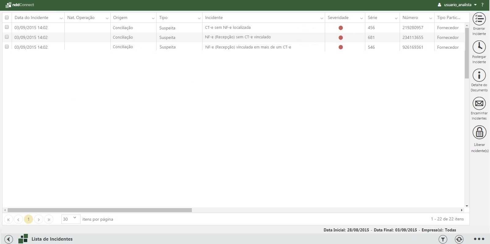 Os incidentes da origem Conciliação visam alertar sobre possíveis problemas relacionados à recepção de mercadorias e o transporte destas. Através de vínculos estabelecidos entre NF-es e CT-es, é possível identificar a falta ou excesso de documentos que formalizam o fluxo de recepção e transporte dentro da organização.