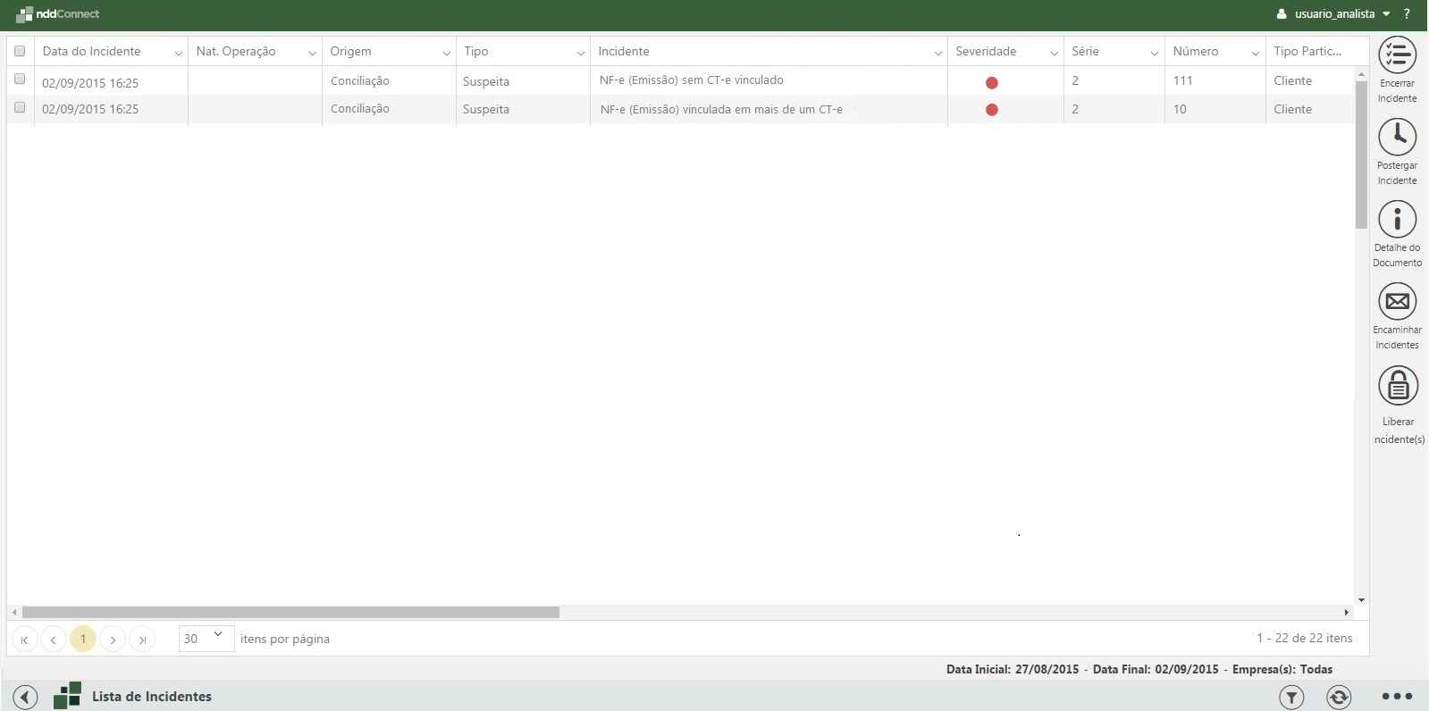 Os incidentes da origem Conciliação, visam alertar sobre possíveis problemas relacionados à emissão de mercadorias e o transporte destas. Através de vínculos estabelecidos entre NF-es e CT-es, é possível identificar a falta ou excesso de documentos que formalizam o fluxo de emissão e transporte dentro da organização.