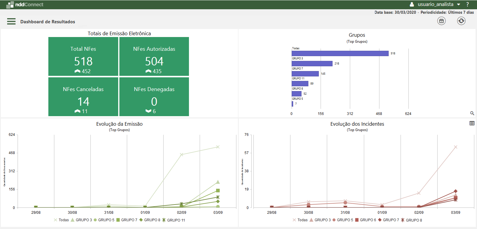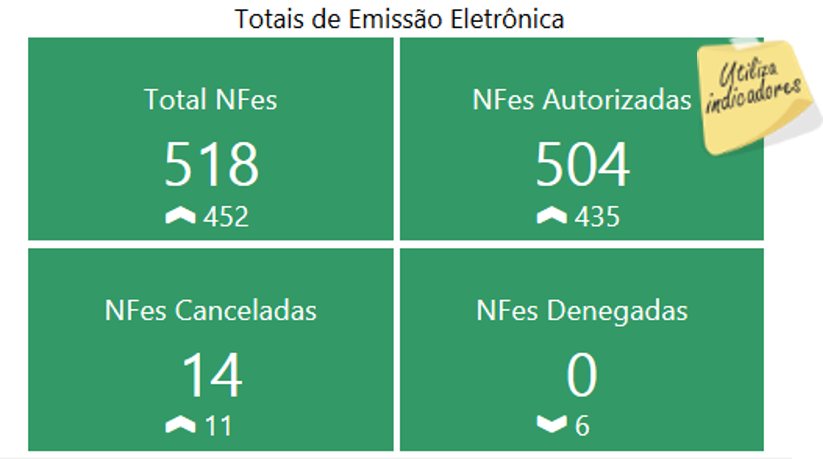 A Dashboard de Resultados de NFe, relaciona gráficos que visam apresentar as informações pertinentes aos documentos emitidos, considerando os grupos de empresas existentes e permissionados ao usuário. Através da Dashboard de Resultados é possível verificar os totais de documentos emitidos em um determinado período, bem como, os grupos de empresas com maior volume de emissão, além da evolução da emissão de documentos e ocorrência de incidentes, em comparação à períodos anteriores.