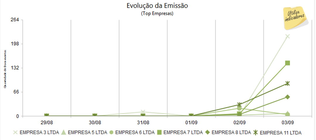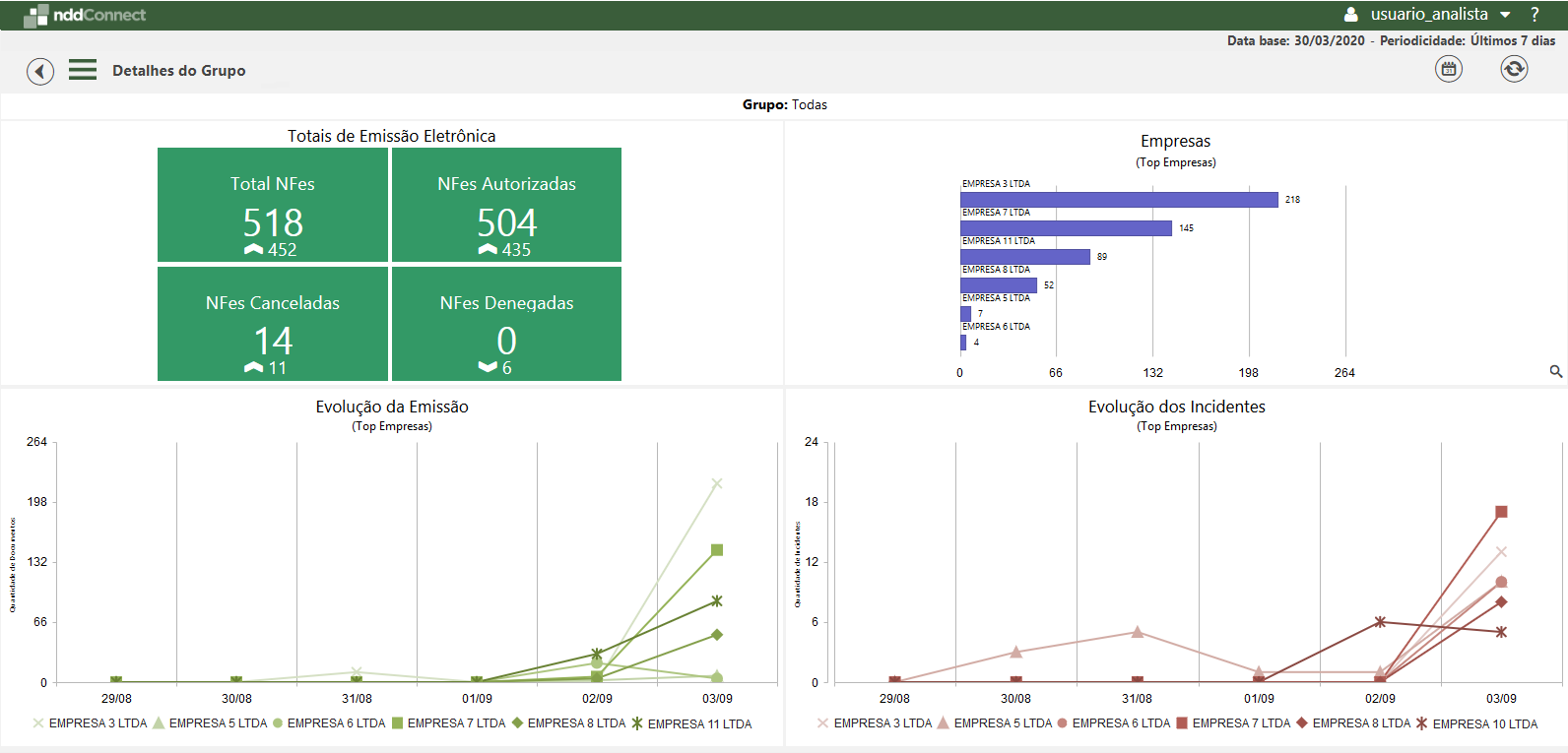 A visão Detalhes de Grupo, apresenta as informações pertinentes aos documentos emitidos, considerando somente as empresas vinculadas ao grupo selecionado. Através da visão de Detalhes de Grupo, é possível avaliar os totais de documentos eletrônicos emitidos, bem como, as empresas do grupo que mais emitiram documentos no período filtrado. Além disso, os gráficos de evolução permitem que sejam comparados a emissão de documentos com relação à períodos anteriores. O mesmo ocorre para a evolução dos incidentes, onde é possível comparar a ocorrência de incidentes entre as empresas do grupo.