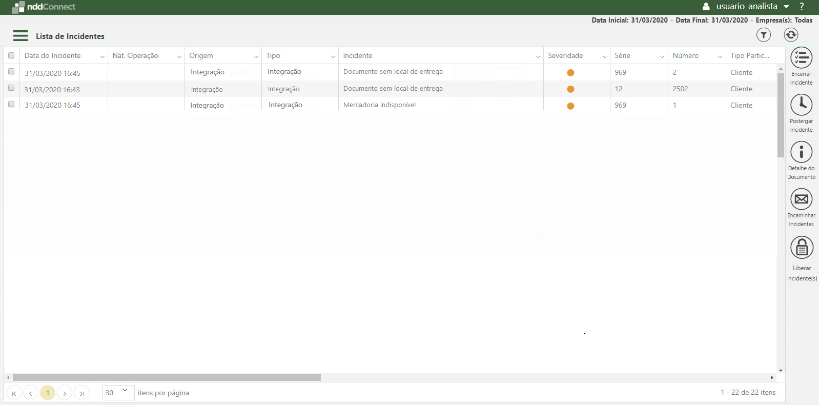 O encerramento de incidentes inseridos via integradores para documentos controlados, pode ser feito tanto via requisição ao Web Service da aplicação, quanto através do Portal de Monitoramento. Não existe por parte da aplicação nddConnect, nenhum controle automático sobre os incidentes que possa encerrar os mesmos automaticamente. A funcionalidade de postergação destes incidentes está disponível somente via Portal de Monitoramento.