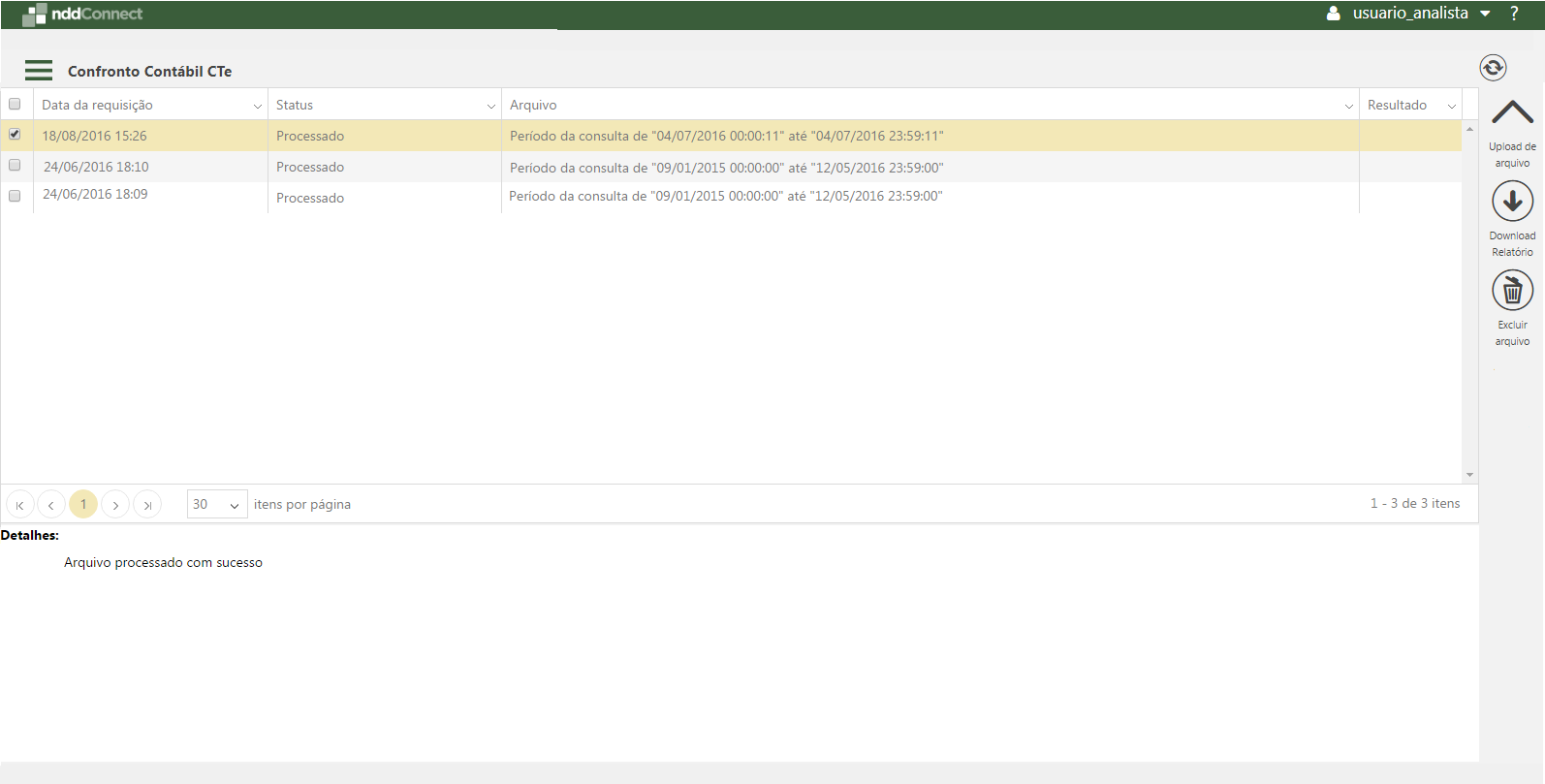 Através do arquivo enviado no upload, é possível identificar os documentos que serão confrontados, informando a chave e o status que estes documentos possuem no ERP/TMS. É possível também, enviar apenas um intervalo de datas, onde serão retornados todos os documentos emitidos para a empresa no período informado, e seus respectivos status. Para ambas as opções, deve ser informada qual a empresa está sendo utilizada para a comparação, isso é necessário para que possam ser incluídos no retorno, os documentos desta empresa presentes na base do nddConnect e que não foram informados no arquivo enviado. |