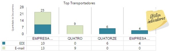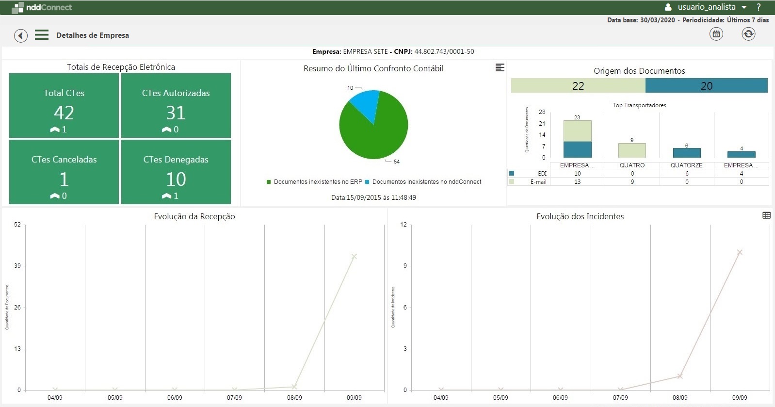Através da visão de Detalhes de Empresa, é possível avaliar os totais de documentos eletrônicos recepcionados pela empresa, bem como, o último confronto contábil realizado. Além disso, são contabilizadas as origens destes documentos e os transportadores através dos quais a empresa teve maior incidência de recepção. Os gráficos de evolução permitem que sejam comparados a recepção de documentos com relação a períodos anteriores. O mesmo ocorre para a evolução dos incidentes, onde é possível comparar a ocorrência de incidentes entre períodos.
