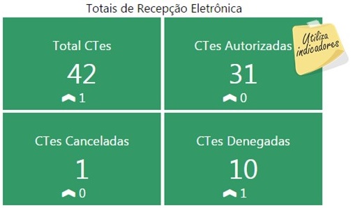 Alguns dados são representados em vários gráficos, porém, em contextos diferentes, pois consideram as mesmas informações (autorização, cancelamento e denegação): •O resultado apresentado no tile Total CTes do gráfico Totais de Recepção Eletrônica, condiz com os resultados apresentados nos seguintes gráficos: oOrigem dos Documentos: soma total das origens; oEvolução da Recepção: contabilização apresentada no período base filtrado. |
