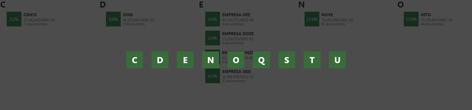 Para cada empresa é apresentado um resumo da quantidade de documentos recepcionados no período selecionado, considerando o último status de cada documento (Autorizado, Cancelado ou Denegado). Com base nas recepções, é mostrado a participação de cada empresa com relação às demais, no período filtrado.