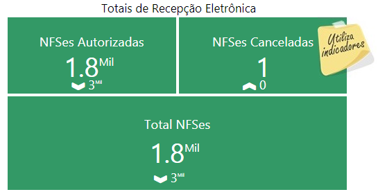 Observação: Alguns dados são representados em vários gráficos, porém, em contextos diferentes, pois consideram as mesmas informações (autorização e cancelamento): •O resultado apresentado no tile Total NFSes do gráfico Totais de Recepção Eletrônica, condiz com os resultados apresentados nos seguintes gráficos: oEvolução da Recepção: contabilização apresentada no período base filtrado; oRegistro de Passagem dos Documentos: totalização apresentada na ocorrência Entrada Eletrônica. |