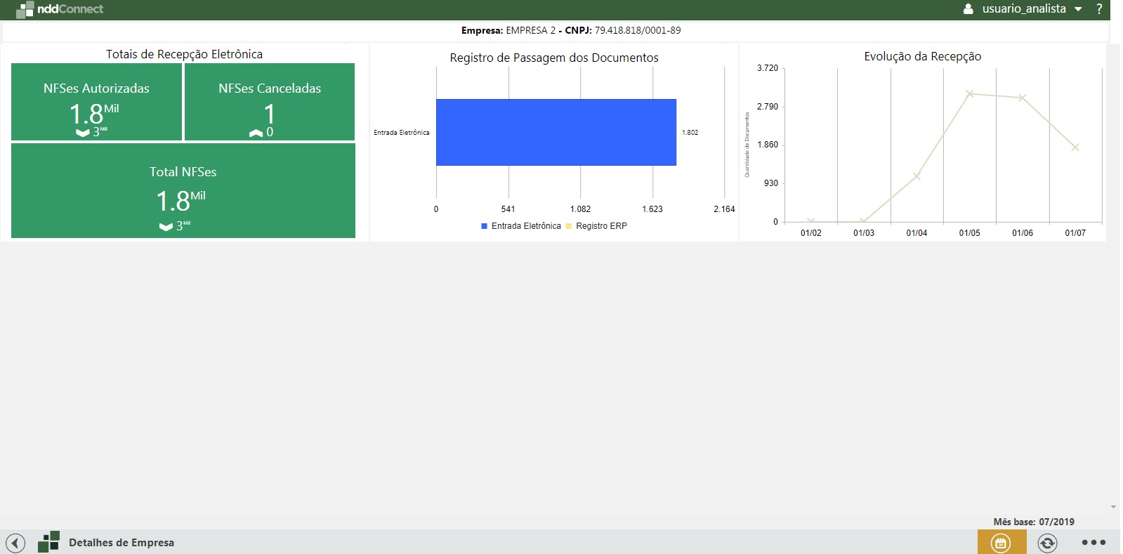 Através da visão de Detalhes de Empresa, é possível avaliar os totais de documentos eletrônicos recepcionados pela empresa, bem como, o último confronto contábil realizado. Além disso, são contabilizadas as manifestações efetuadas para os documentos e as origens destes. Os gráficos de evolução permitem que sejam comparados a recepção de documentos com relação a períodos anteriores.