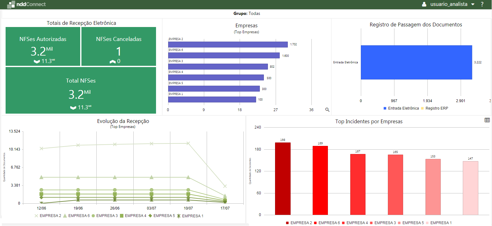 Através da visão de Detalhes de Grupo, é possível avaliar os totais de documentos eletrônicos recepcionados, bem como, as empresas do grupo que mais recepcionaram documentos no período filtrado. Além disso, são contabilizadas as manifestações efetuadas para os documentos e as origens destes. Os gráficos de evolução permitem que sejam comparados a recepção de documentos com relação a períodos anteriores. O mesmo ocorre para a evolução dos incidentes, onde é possível comparar a ocorrência de incidentes entre as empresas do grupo. Para os incidentes, ainda é possível identificar as empresas que mais tiveram ocorrências.