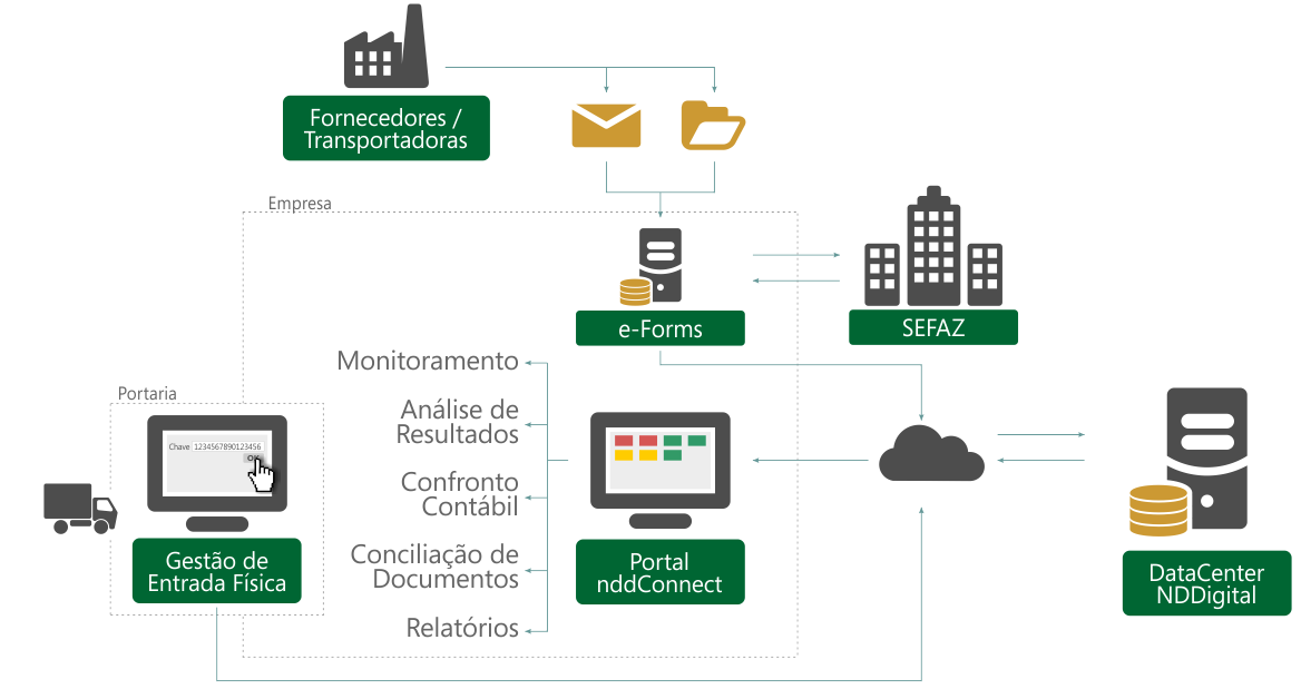 O módulo Gestão de Entrada, do produto nddConnect, visa proporcionar às empresas o monitoramento da recepção de documentos eletrônicos, bem como, o acompanhamento de possíveis problemas que possam ocorrer no processo de entrada, e a resolução dos casos identificados como falha pela aplicação.