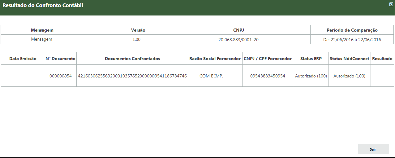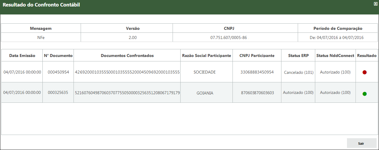Através dessa visualização é possível comparar o status de cada documento no ERP com o status deste documento no nddConnect, também é possível visualizar as informações do participante dos documentos emitidos para a empresa consultada no período informado e o resultado de cada documento. Seguem os status apresentados no resultado do Confronto Contábil: •Autorizado; •Cancelado; •Denegado; •Rejeitado; •Falha de processamento do documento no e-Forms.