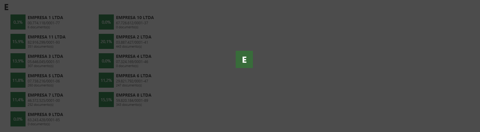 Para cada empresa é apresentado um resumo da quantidade de documentos emitidos no período selecionado, considerando o último status de cada documento (Autorizado, Cancelado ou Denegado). Com base nas emissões, é mostrado a participação de cada empresa com relação às demais, no período filtrado.