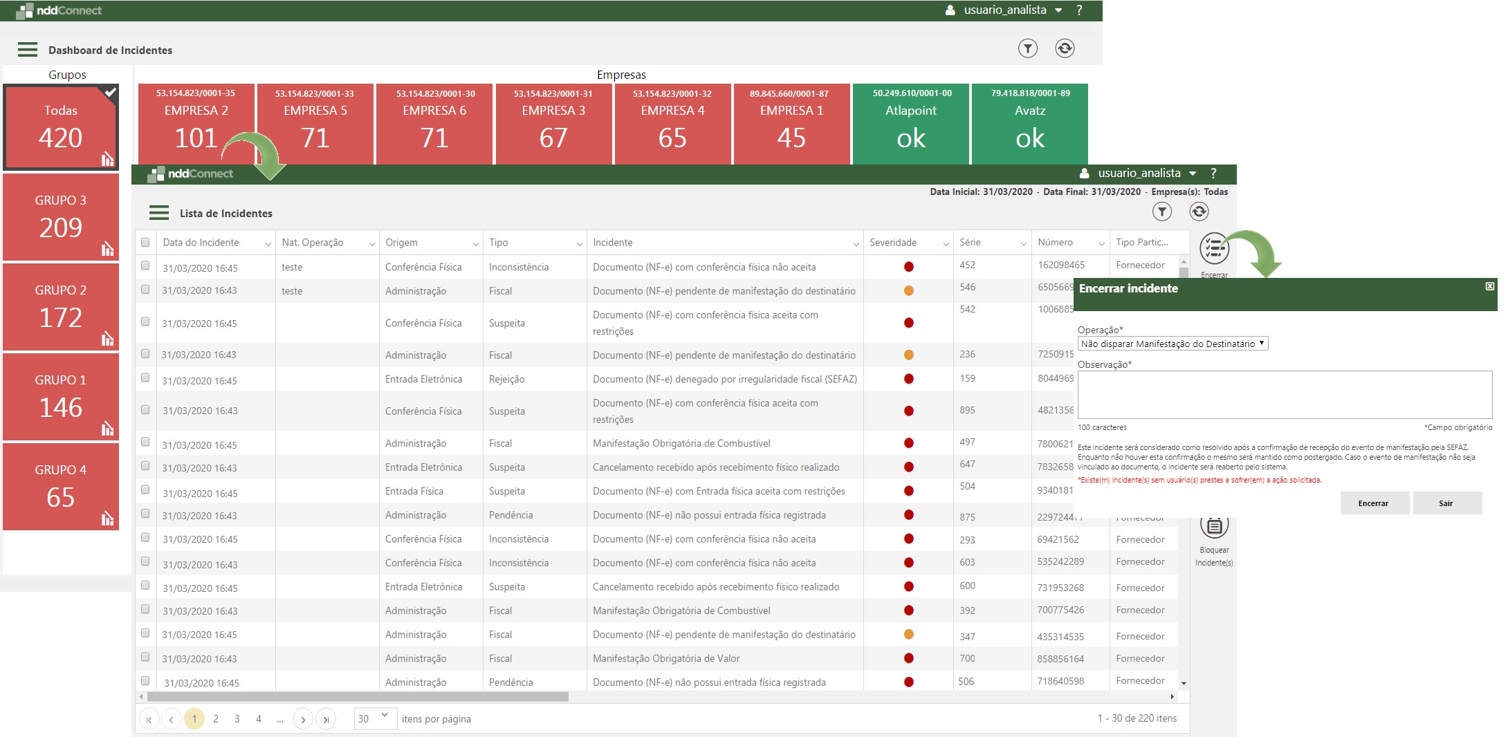 As visões pertencentes ao Monitoramento, têm o objetivo de mostrar e relacionar os incidentes gerados para as empresas, agrupando os alertas de todas as gestões: Entrada, Emissão, Outros Documentos e Documentos Controlados. Além disso, possibilita ao usuário o encerramento manual dos incidentes e facilita a execução de manifestações pendentes.
