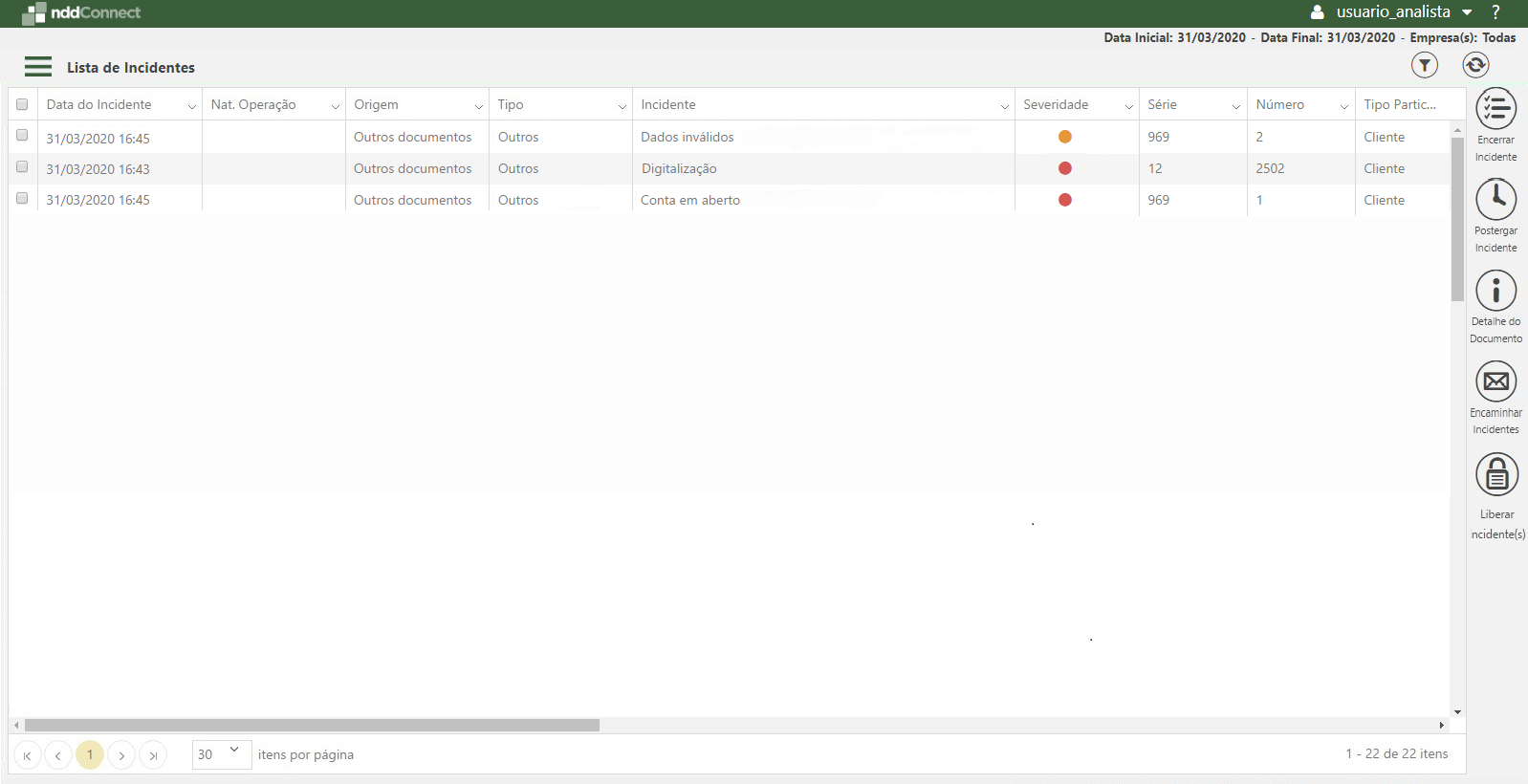 oDashboard de Incidentes: onde os incidentes serão contabilizados à empresa informada no envio do documento vinculado ao mesmo;