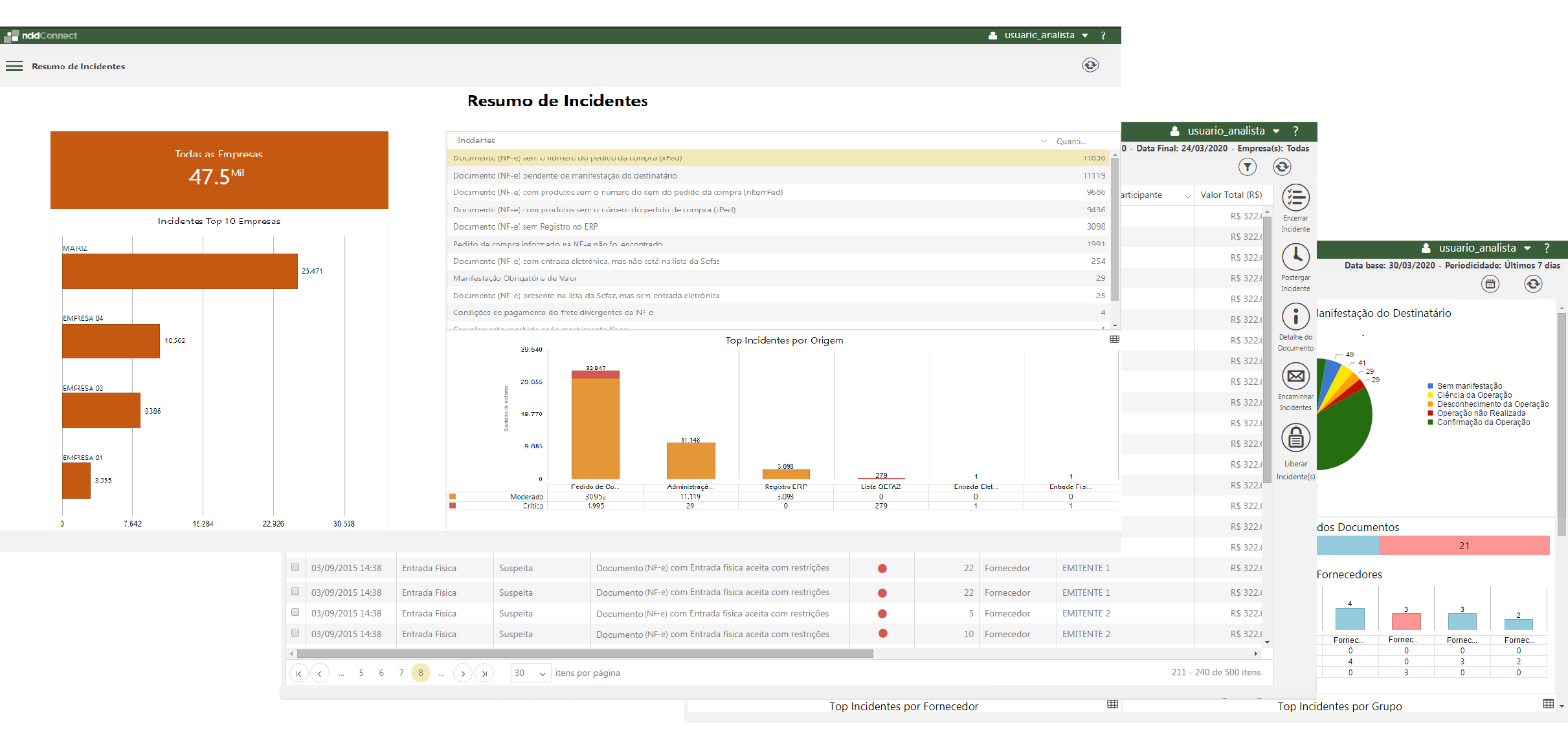 O Portal de Monitoramento da solução nddConnect proporciona o acompanhamento dos documentos recebidos, emitidos e documentos em geral, bem como, a sinalização por meio de incidentes de possíveis falhas com relação aos documentos e mercadorias com os processos internos da empresa. Além disso, possibilita a visualização do ambiente operacional da organização como um todo, dando ao usuário informações sobre possíveis falhas no processo fiscal.