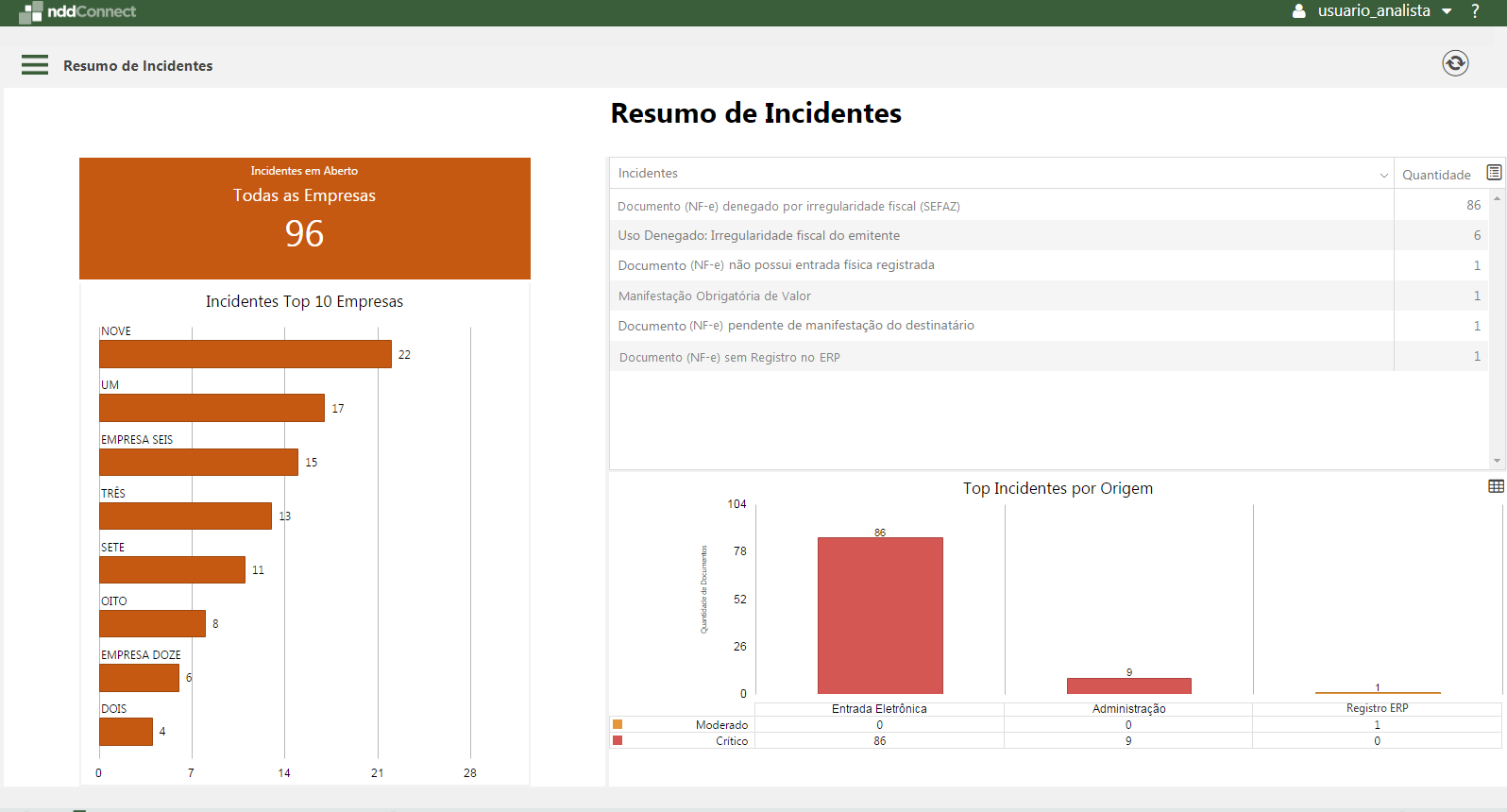 Fornece informações da quantidade de incidentes abertos para as empresas do grupo selecionado, subdividindo-os por origem: Administração, Conferência Física, Registro ERP, Entrada Eletrônica, Entrada Física, Lista SEFAZ, Emissão Eletrônica e Outros Documentos. Além disso, os categoriza entre críticos e moderados, apresentando os valores referentes a cada categoria na legenda. Também é possível visualizar a quantidade de incidentes abertos para cada categoria, através de tooltips mostrados ao posicionar o mouse sobre cada pilha do gráfico. Pelo ícone disponibilizado neste gráfico, é possível voltar para a Dashborad de Incidentes. |