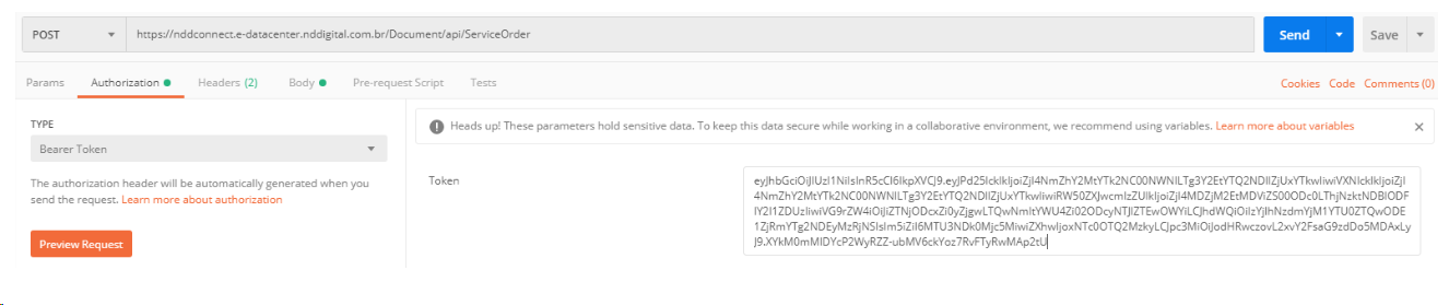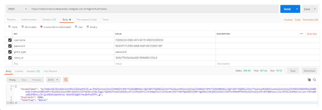 A imagem abaixo ilustra a chamada de autenticação, a qual irá retornar o token de acesso a API.