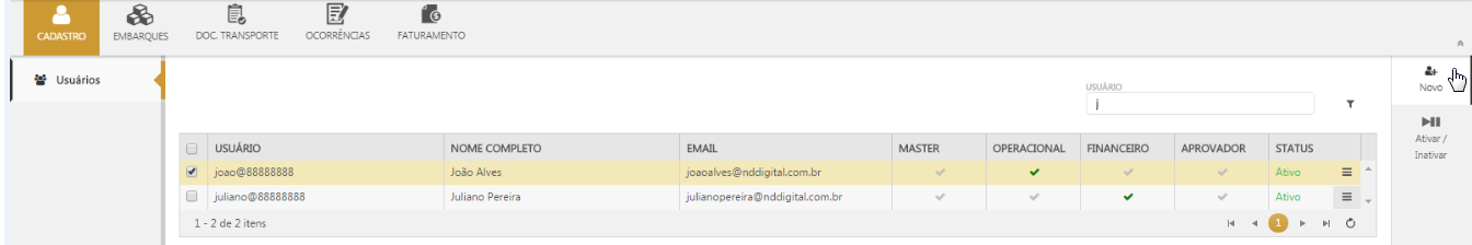 A criação de um novo usuário está disponível apenas para o usuário master através da opção Novo, no menu Usuários da aba Cadastro, onde são listados os usuários: