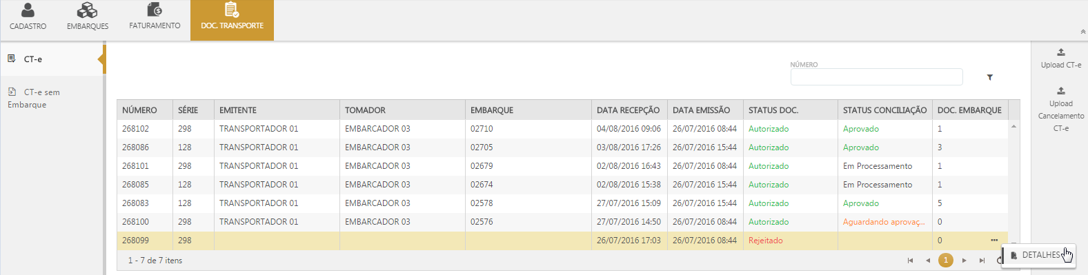 •Aprovado: Este status indica que o CT-e foi vinculado com sucesso ao embarque e estará disponível para ser incluso na fatura;