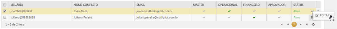 Através da opção Editar, presente no botão de ações do registro de cada usuário, é possível ter acesso às informações dos usuários.